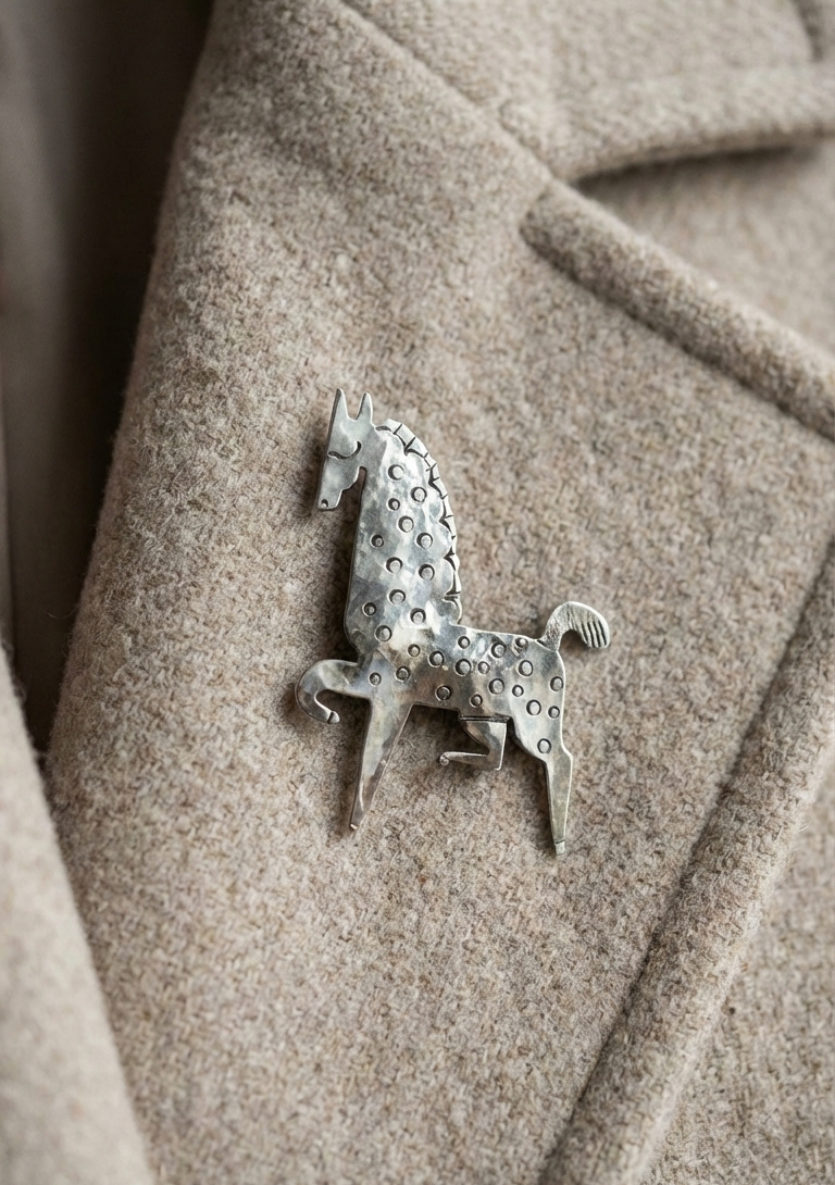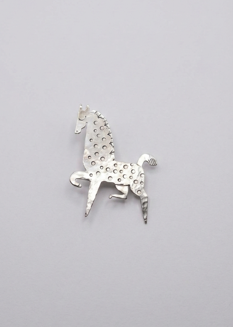 Spokojna, dostojną broszka przedstawiająca stojącego konia, wykonana z melchioru – stopu miedzi i niklu o delikatnym, srebrnym blasku. Koń w pozie stojącej emanuje spokojem, siłą i pewnością siebie.