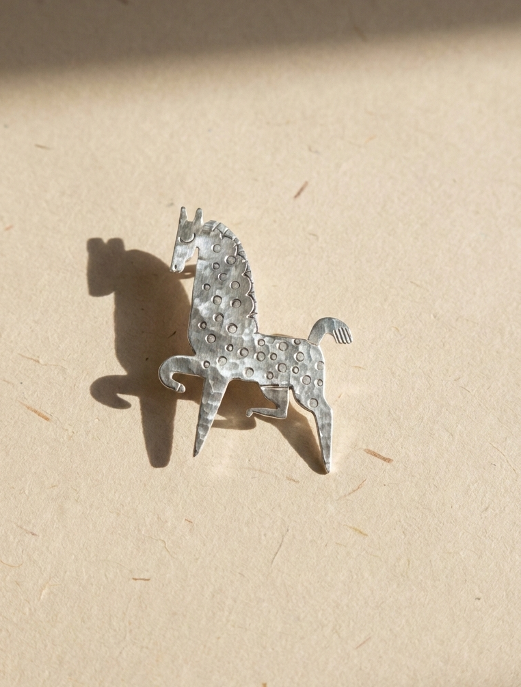Broszka powstała w małej pracowni, gdzie każdy szczegół jest ręcznie opracowywany. Sylwetka stojącego konia została oddana z dbałością o proporcje i wyraz – zwierzę stoi dumnie, z uniesioną głową. Melchior nadaje broszce szlachetny, srebrny odcień, który pięknie współgra z różnorodnymi stylizacjami, dodając im elegancji i klasy.