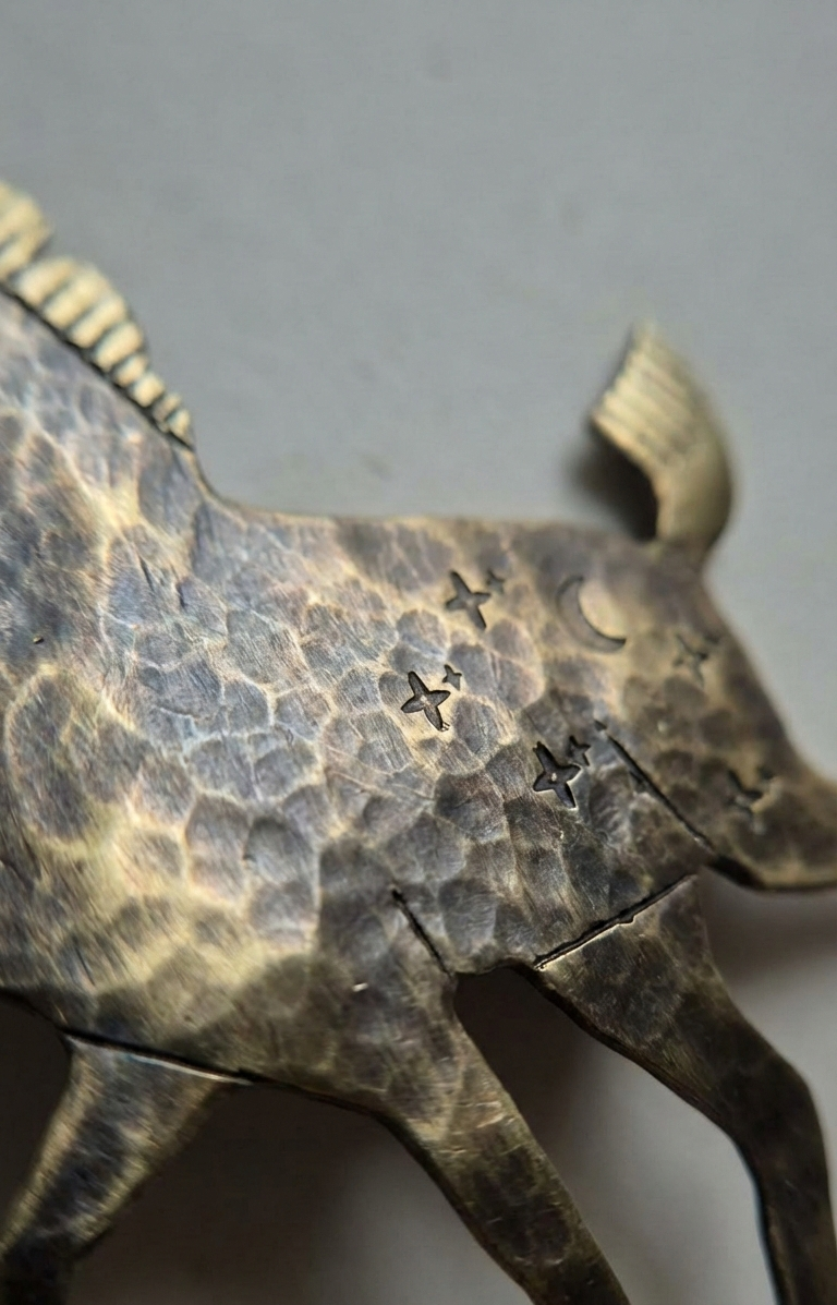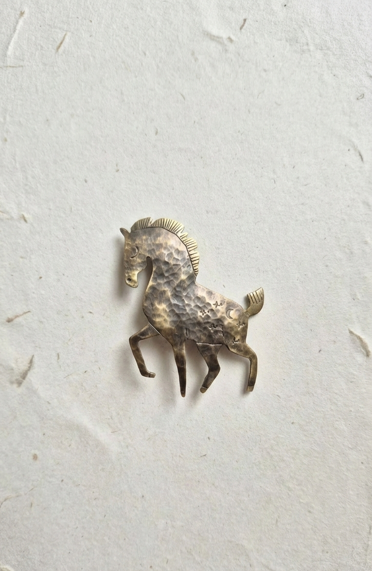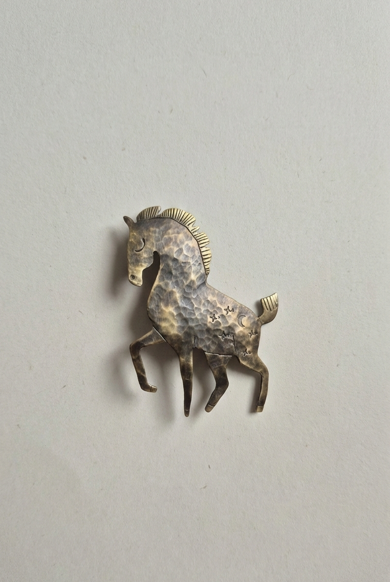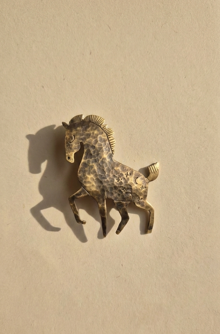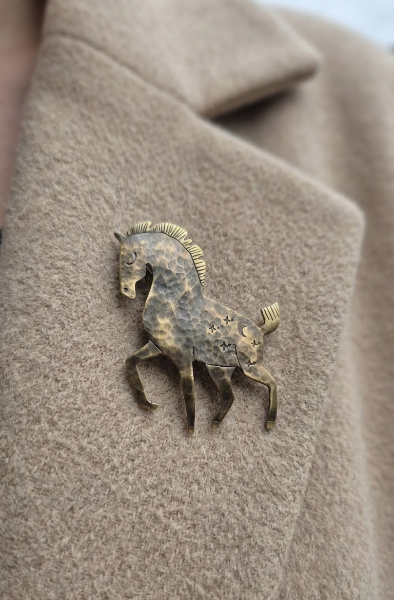 Wyjątkowa broszka przedstawiająca konia w pełnym galopie, wykonana z mosiądzu – stopu miedzi i cynku, który od stuleci ceni się za swój ciepły, złocisty blask. To nie tylko ozdoba, ale wyraz podziwu dla jednego z najpiękniejszych stworzeń – symbolu niezależności i naturalnej graсji.