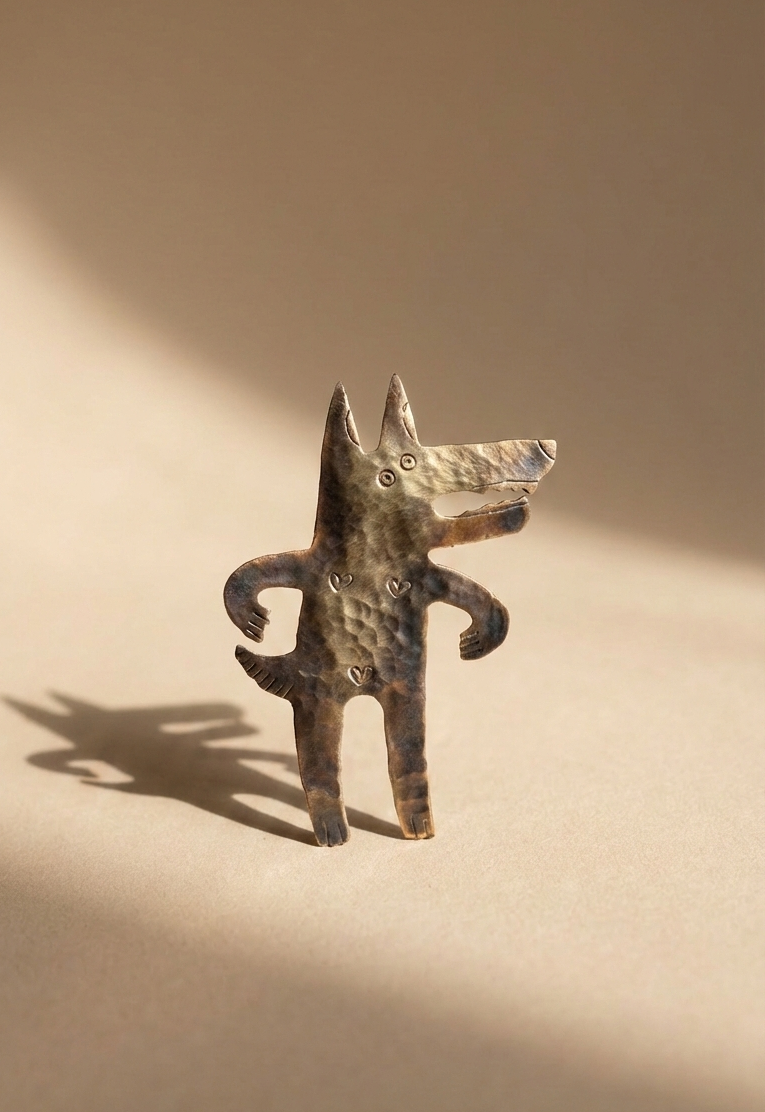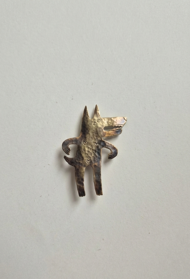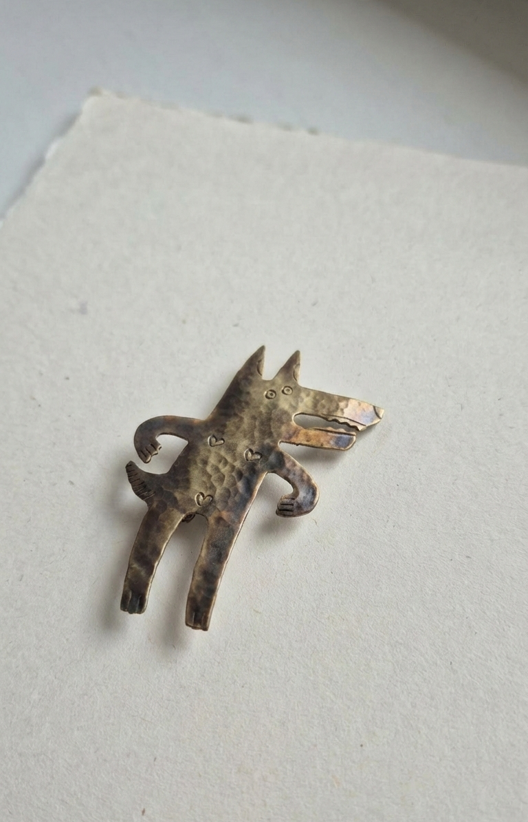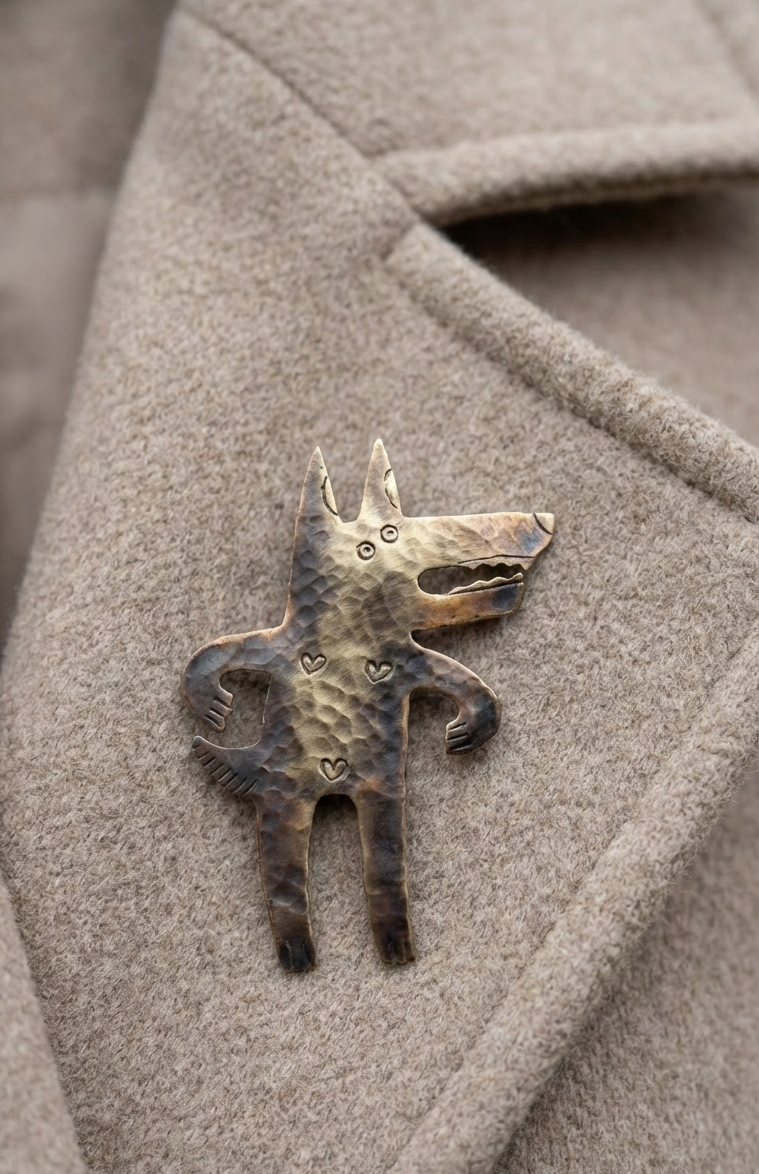 Urocza broszka przedstawiająca wilczycę z charakterem! Ta mała drapieżniсяka z mosiądzu patrzy na świat z ciekawością. Idealna dla osób, które lubią zwierzęta z osobowością.