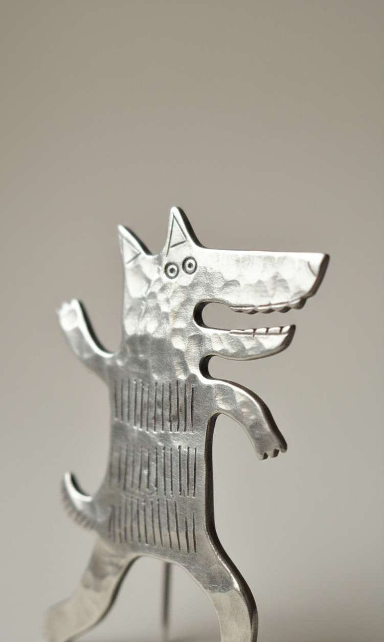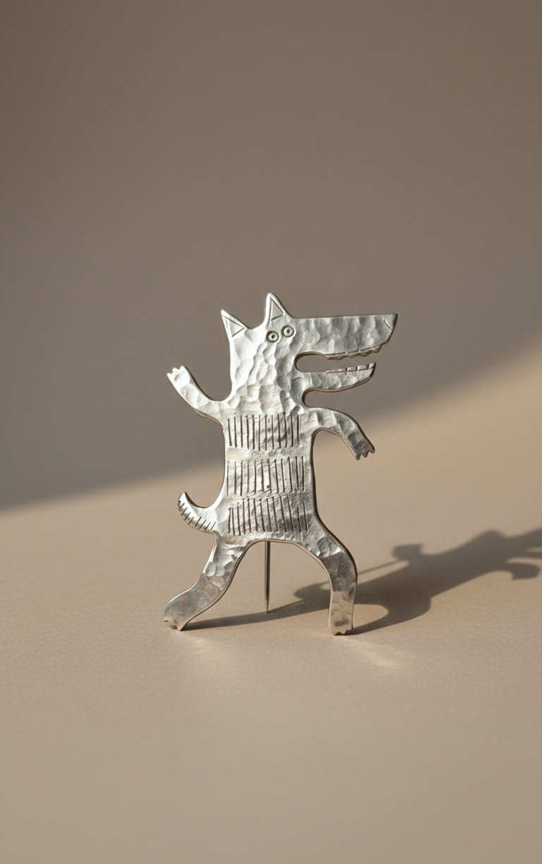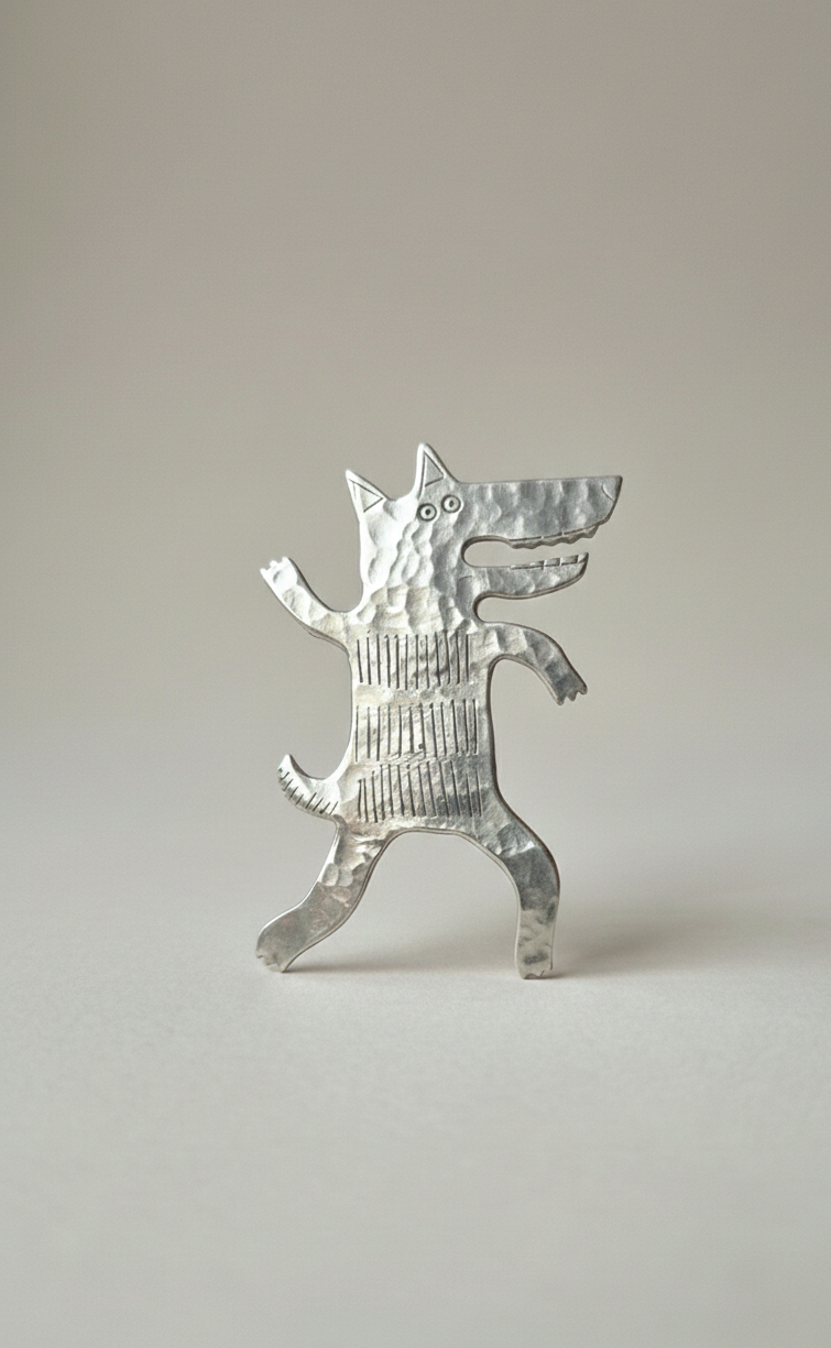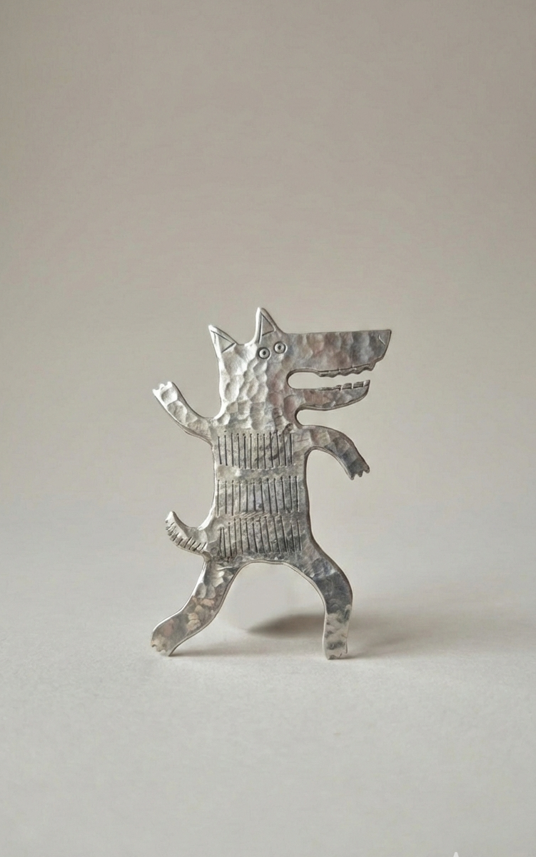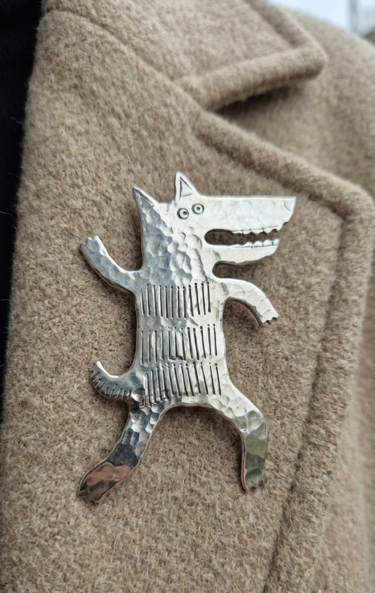 Potężna broszka w kształcie wilka wykonana z melchioru – szlachetnego stopu miedzi i niklu o srebrnym połysku. Wilk od wieków symbolizuje siłę, odwagę, wolność i lojalność wobec stada.