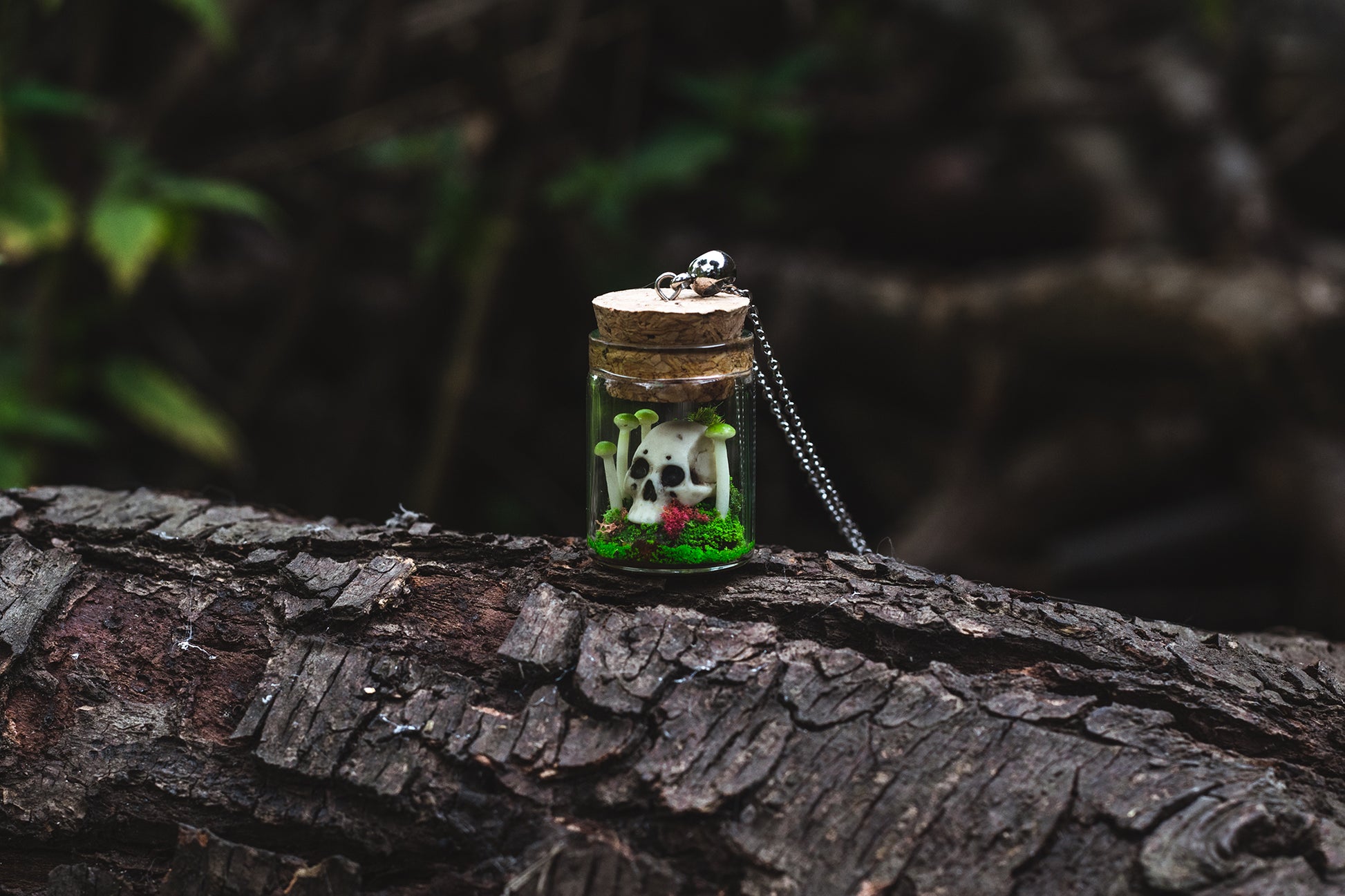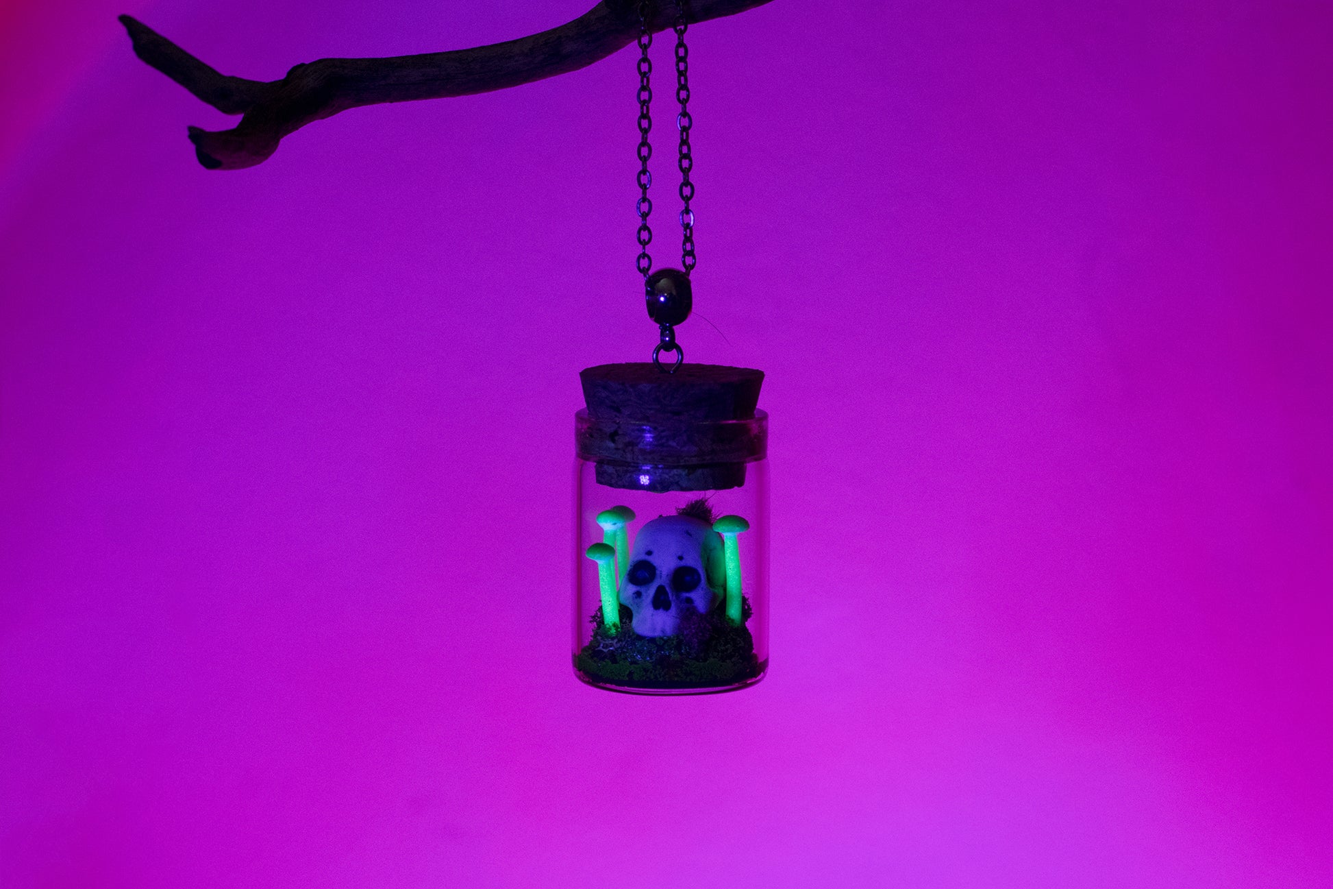 Naszyjnik z czaszką i grzybami świecący się- ręcznie robiony