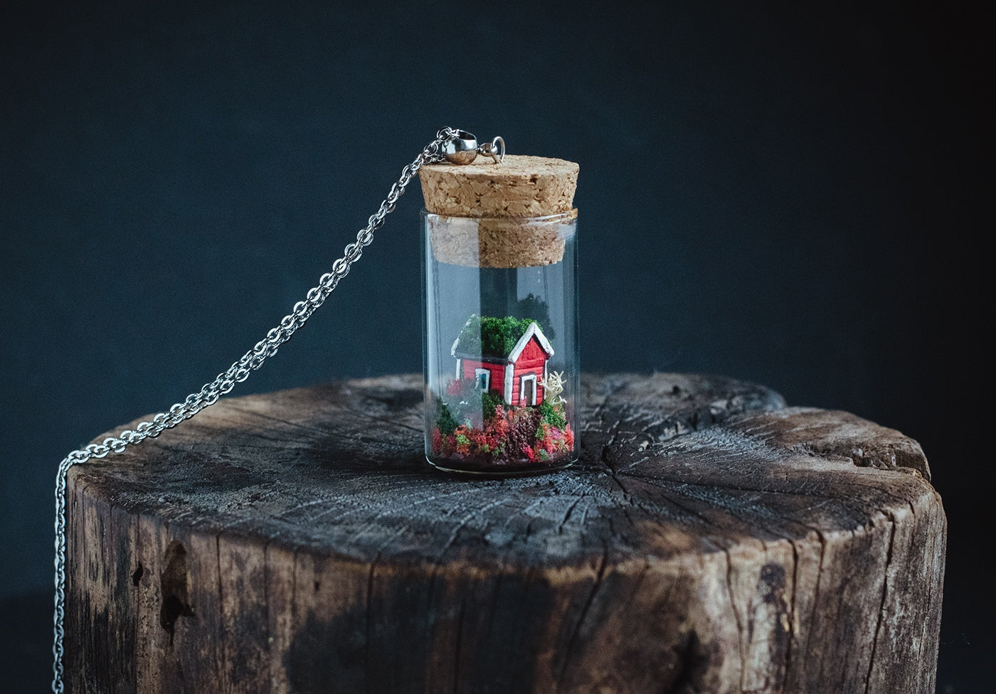 Wyjątkowy naszyjnik z miniaturowym domkiem zamkniętym w szklanej buteleczce. Każdy egzemplarz jest niepowtarzalny dzięki autorskiej ręcznej pracy, która nadaje mu unikalny charakter.